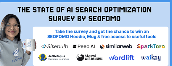Help uncover the state of AI search optimization by completing this short survey and get the chance to win an SEOFOMO hoodie, mug, as well as free access to some of the best AI search, SEO and digital marketing tools: Similarweb, Peec AI, SparkToro, Advanced Web Ranking, Sitebulb, Wordlift, Waikay, JetOctopus.
